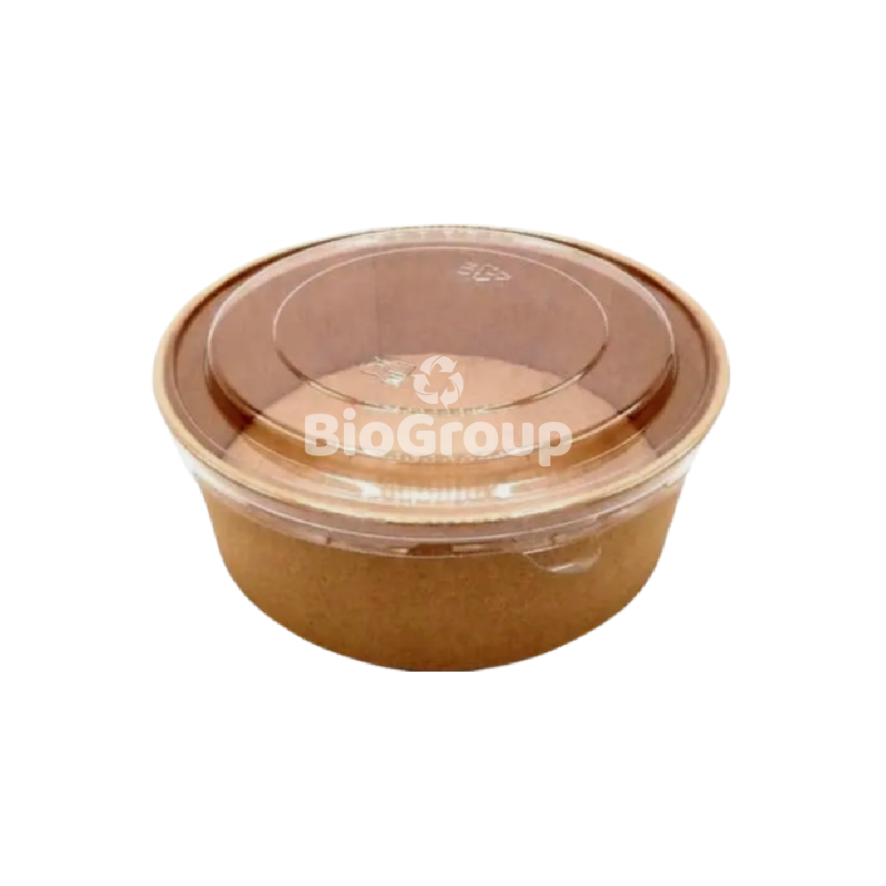 Bowl kraft laminado interior PLA 750, 1000, 1300 ml + tapa PET transparente. Antifugas, apto microondas (sin tapa) y refrigeración. Bowl compostable en planta industrial, tapa PET reciclable. Alternativa al tecnopor que cumple Ley 30884. Empaque: caja sellada de 600 und protegidas con bolsa.